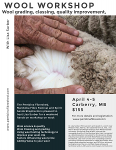 The Pembina Fibreshed, Manitoba Fibre Festival and Spirit Sands Shepherds is pleased to host Lisa Surber for a weekend hands on workshop on wool including these topics: